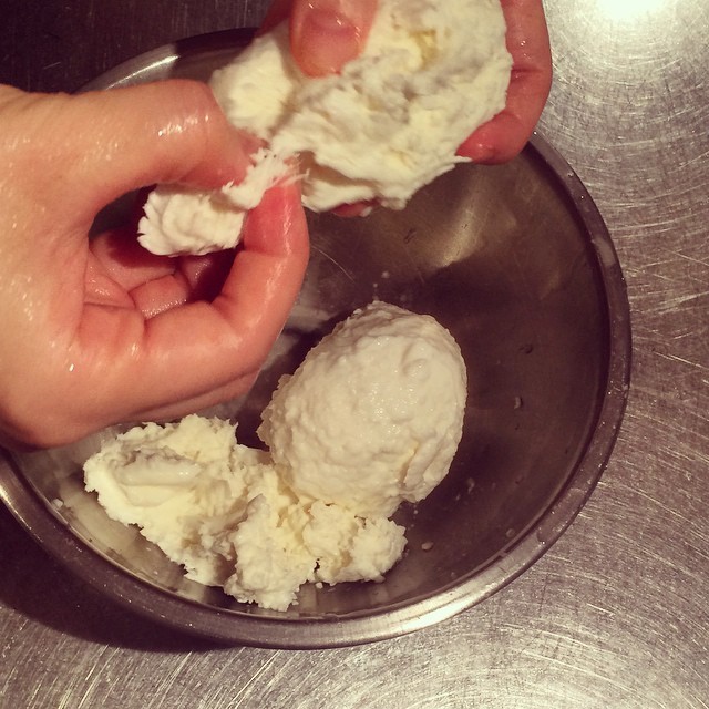 ①まずはモッツァレラチーズを手でちぎります。包丁で切ると断面にソースがうまく絡みません