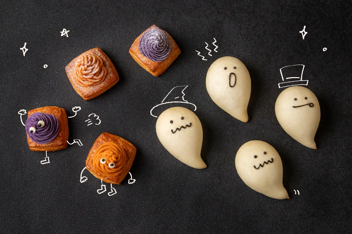 10月1日(水)から31日(金)まで、ハロウィンをテーマにした「マロンクリームデニッシュ」と「おばけパン」も登場予定。可愛らしい表情のパンが店内を彩ります。