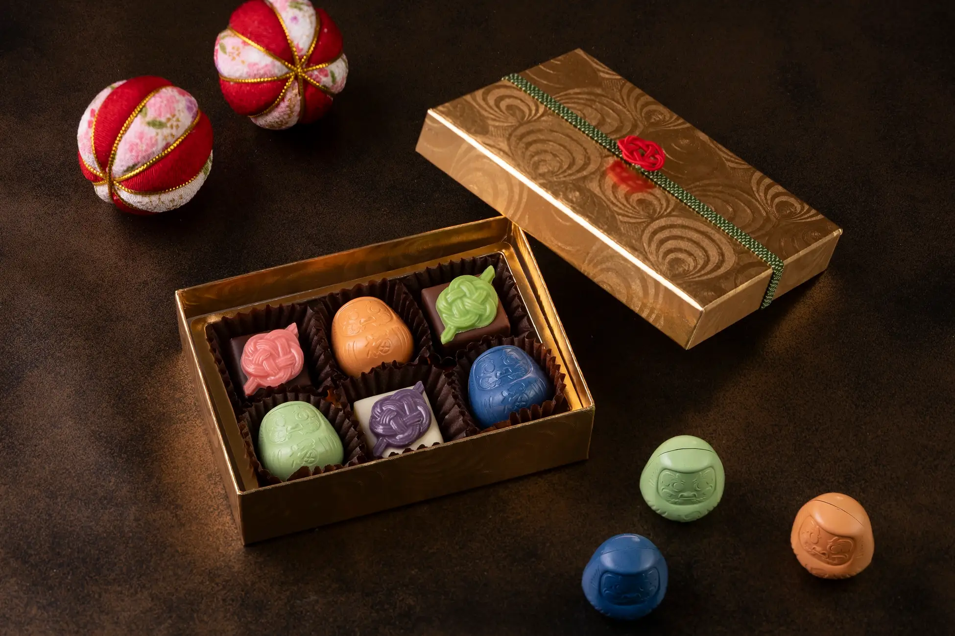1階のTHE SHOP at the Parkでは、強運カラー6色の達磨と水引を模ったチョコレートの詰め合わせを販売します。達磨には男性の強運カラー、水引には女性の強運カラーを用い、それぞれ異なる味わいを楽しめるようになっています。