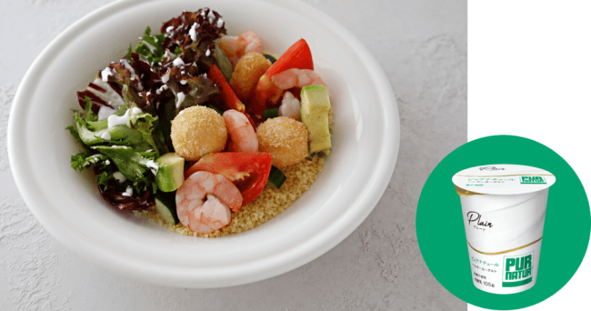 小エビとトマトを使ったベルギーの伝統料理を再構築し、食べやすいサラダボウルに仕立てました。サラダのシャキシャキ感、クスクスのプチプチ感、さらにズワイガニのクリームコロッケのサクサク感が絶妙にマッチ。ベルギーヨーグルト ピュアナチュールのドレッシングでさっぱりまろやかに仕立てました。